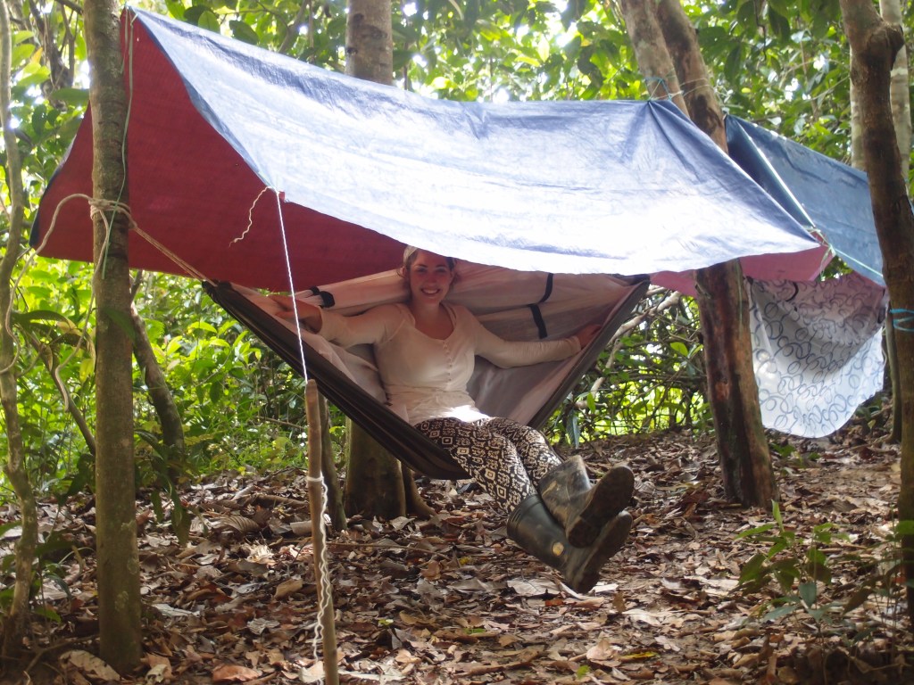 Die vrijdag daarna werd het tijd voor ons tweede avontuur in een korte tijd. De jungletrekking van 5 dagen en 4 nachten. Met een backpack vooral gevuld met eten, gespannen voor wat er komen ging en Eve onze lieve kampsleider die ons heel vrolijk uitzwaaide (ja zij hoefde de jungle niet in), vertrokken we in de vroege ochtend. Ik kan hier eigenlijk niet zo veel over vertellen, behalve dat ik het heel leuk vond. We maakten iedere ochtend een trekking naar onze volgende bestemming. Bij aankomst moesten we vrijwel meteen altijd onze hangmat ophangen en konden we daarna altijd even douchen. Douchen? Ja gewoon in de rivier, omringd door bloedzuigers. Heerlijk. Nee, maar serieus ik vond het echt heel leuk. Die bloedzuigers boeiden niet zoveel meer. Als je je afvraagt of een hangmat comfortabel is, niet echt. Mijn benen zijn erg lang dus ik zat een beetje opgevouwen. Het is wel heerlijk om in slaap te vallen met de jungle geluiden om je heen. Na 5 dagen toen we de jungle eindelijk uit waren, was de douche en eten wel extreem geweldig. Je voelt je zo vies na 5 dagen. De rivier was veel te koud om je echt normaal te kunnen wassen. En het eten bestond uit aardappelen (die we vanwege het gewicht zo snel mogelijk opgegeten hebben), instant noodles, oatmeal (wat niet te eten is zonder suiker), klef zoet brood met tonijn en baked beans.