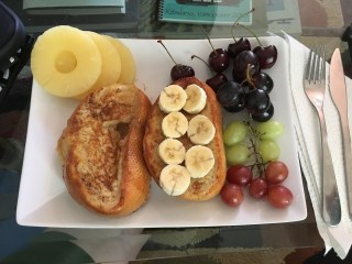 Aldaar stond er namelijk een heerlijke ontbijt/lunch klaar en elke hap bracht me een stukje dichterbij zonneschijn. Volgens hem was het een typisch Canadees gerecht. Frenchtoast met jam en mascarpone. Ik zie je al denken, Mascarpone is kaas toch? Jawel, maar je bent het vast met me eens dat het totaal niet kazig smaakt.