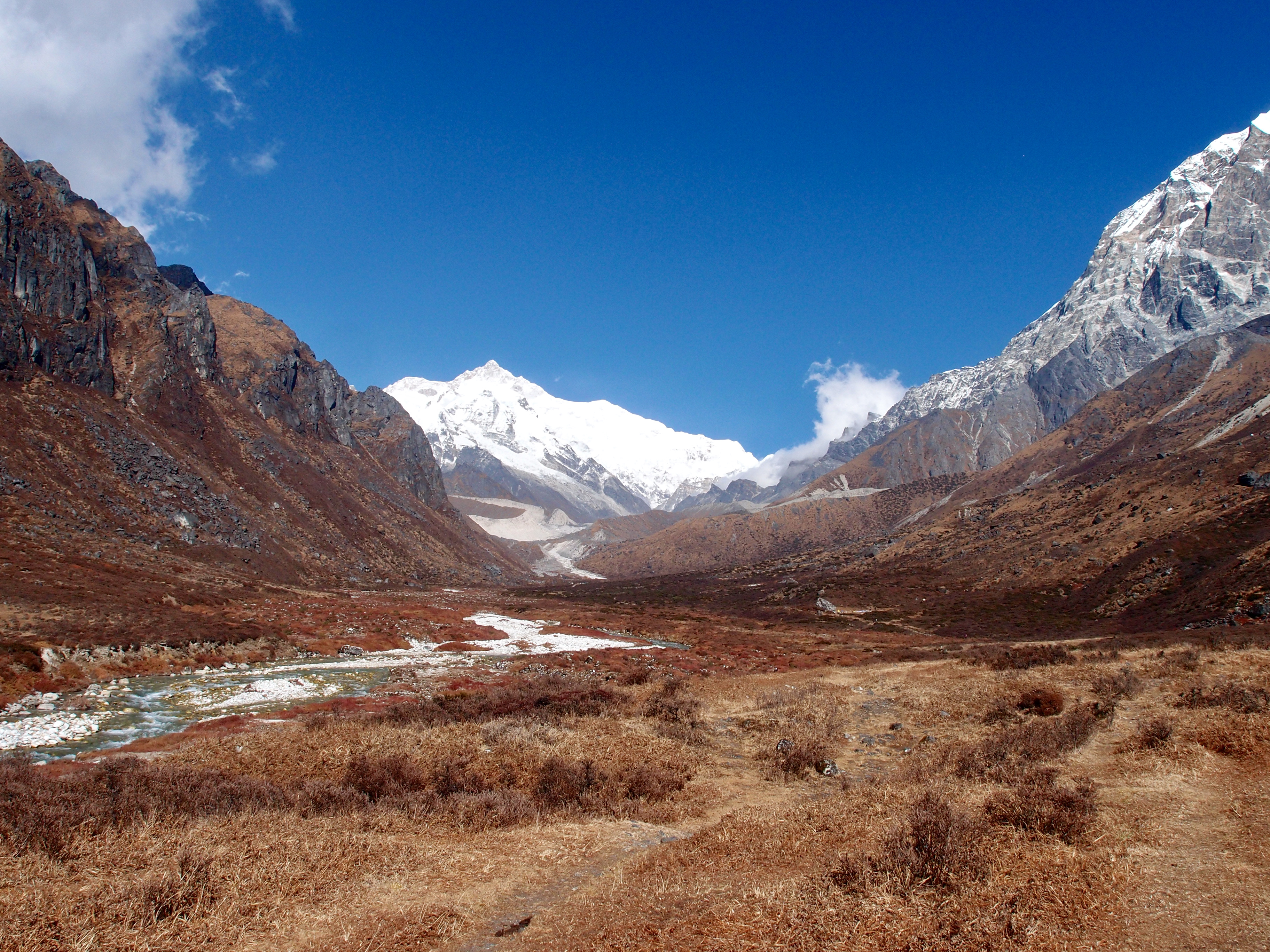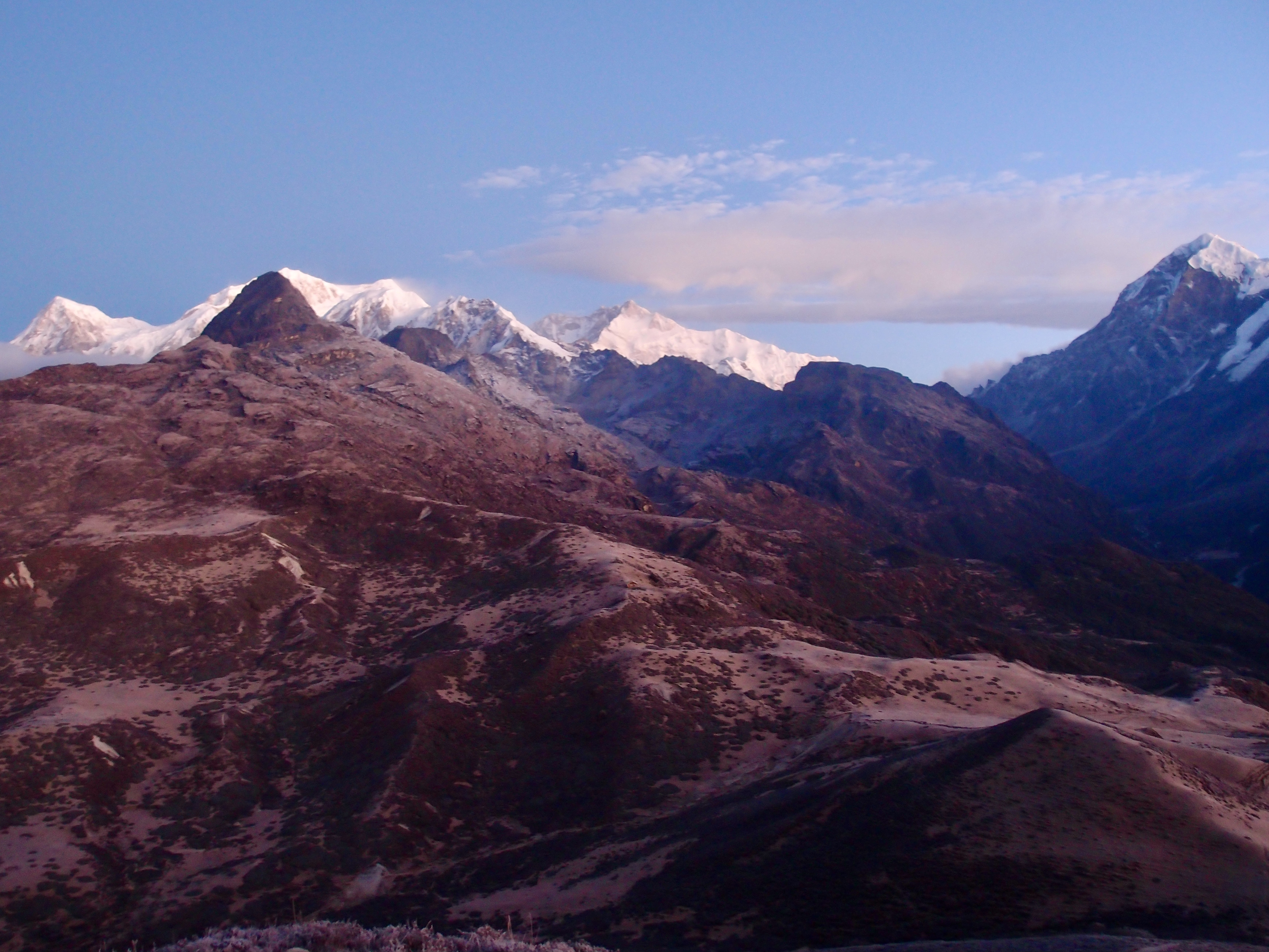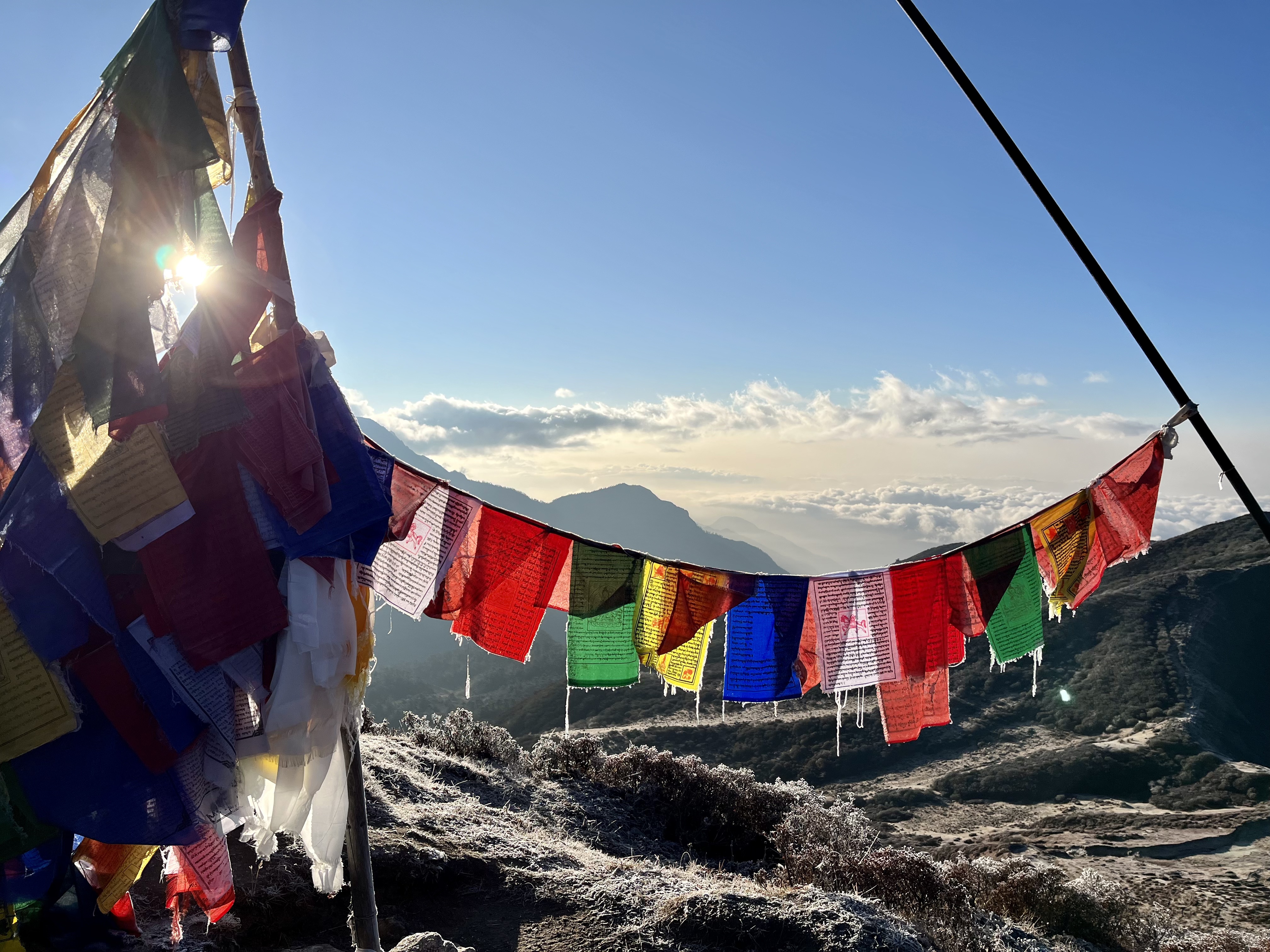 The next morning we climbed the Dzongri top (circa 4000 meter) to see the sunrise. We woke around 4AM, both armed with 2 pair of socks, 3 layers for our legs, 4 layers for our upper body (underwear excluded). Outside (and inside) the tent a layer of frost was covering the landscape, even the little creek next to the tent was partly frozen. During our walk up the layers made us hot, and at the top Jelle almost lent his jacket to Mina, however when standing still enjoying the view, we realized we were glad we were wearing all the layers.