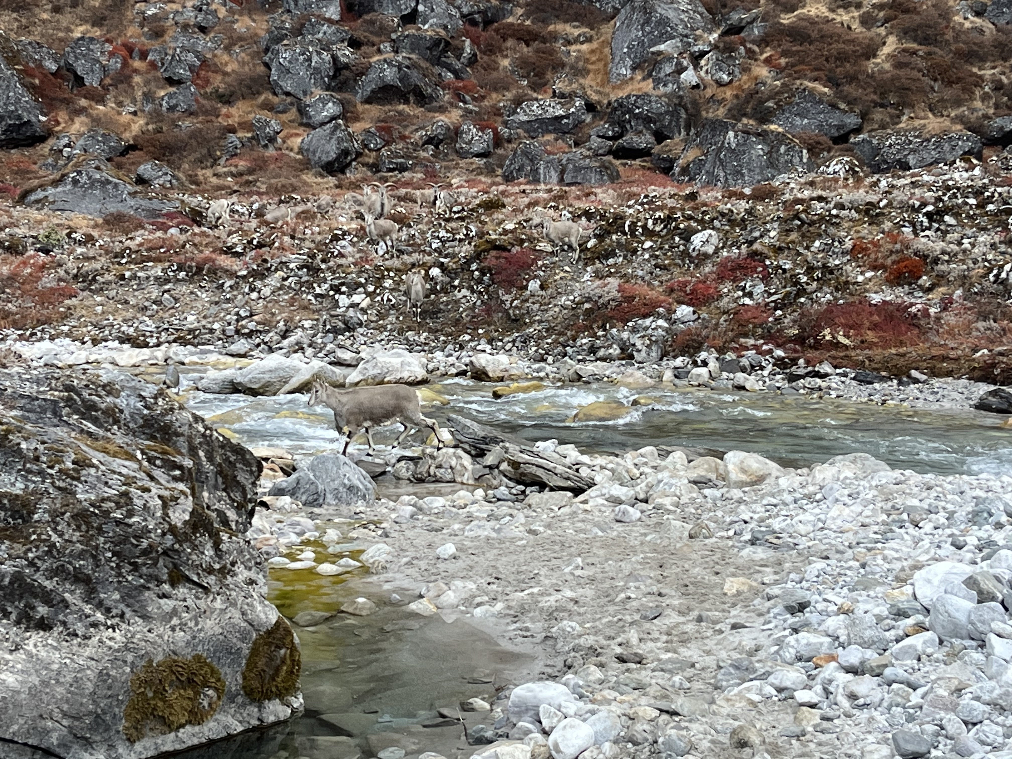 The next morning, we had a lazy start, because we only had to walk 3km, over flat terrain. However, as a Dutch person you might think really “flat” if someone says flat. But.. for people living in the mountains flat means up and down but never “really” steep. Nevertheless, it was a peaceful day and our next campsite was a really windy place, were Jelle found himself a boulder to kill some time, and I forced myself in 3 layers of clothes and wind jacket, to read my book in the sun (finally a very clear sky). During an evening stroll with Lakshman and Sanjai we saw some blue sheep crossing the river.
