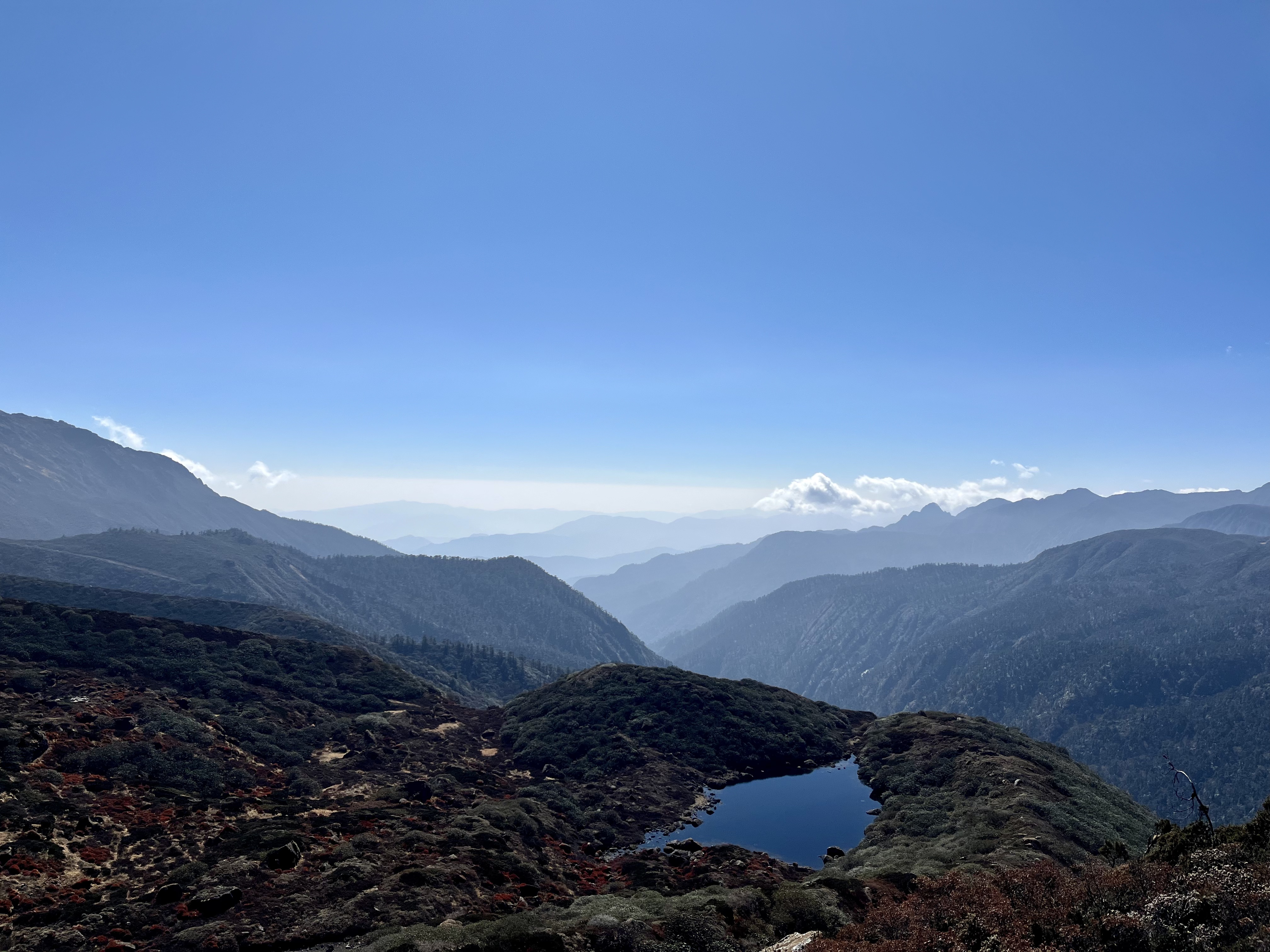 The way down was in the day light and more peaceful. We had time to make pictures and really taking in the amazing views of the peaks, and a (holy) mountain lake. For a second Jelle was tempted to make a jump, but our guide told us that was not allowed anymore because this lake is the source of the river that is the main water recourse from Yuksom. Since trekkers made a mess of this lake it is announced holy, so people treat the lake with more respect.