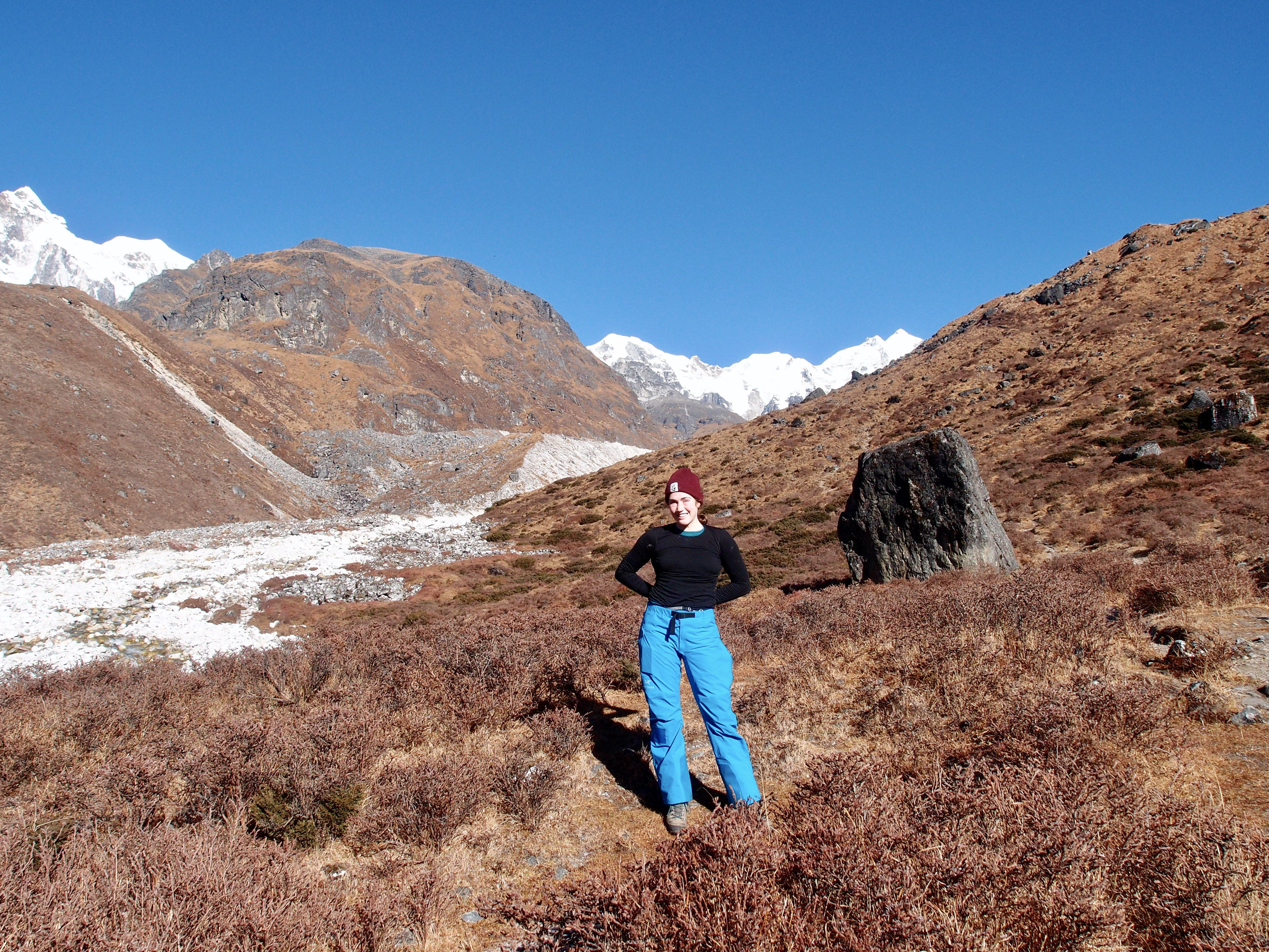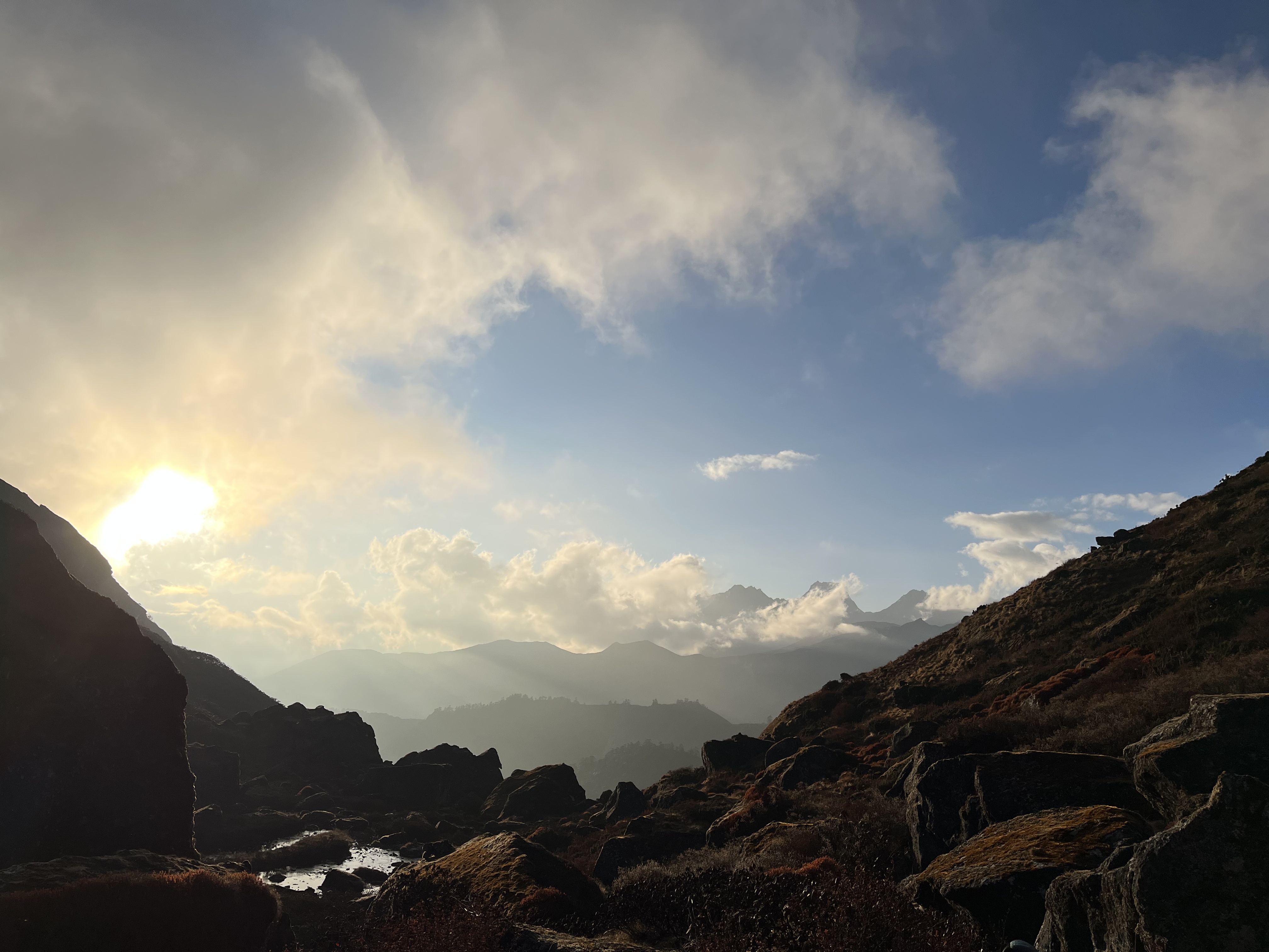 The first night we slept between high boulders, and because my tiredness made me ask in tears if we could not sleep somewhere else, because it reminded me of my fall 3 years ago during mountaineering in the Austrian Alps. After some noodle soup and beautiful sunset over the 5 layer mountain-range ahead of us I came to my senses and finally actually enjoyed our stay there. Especially because the crew was sleeping in a cave created by the boulders, were collecting hay to sleep on, and creating a fire to keep the Himalayan bears away. What an experience.