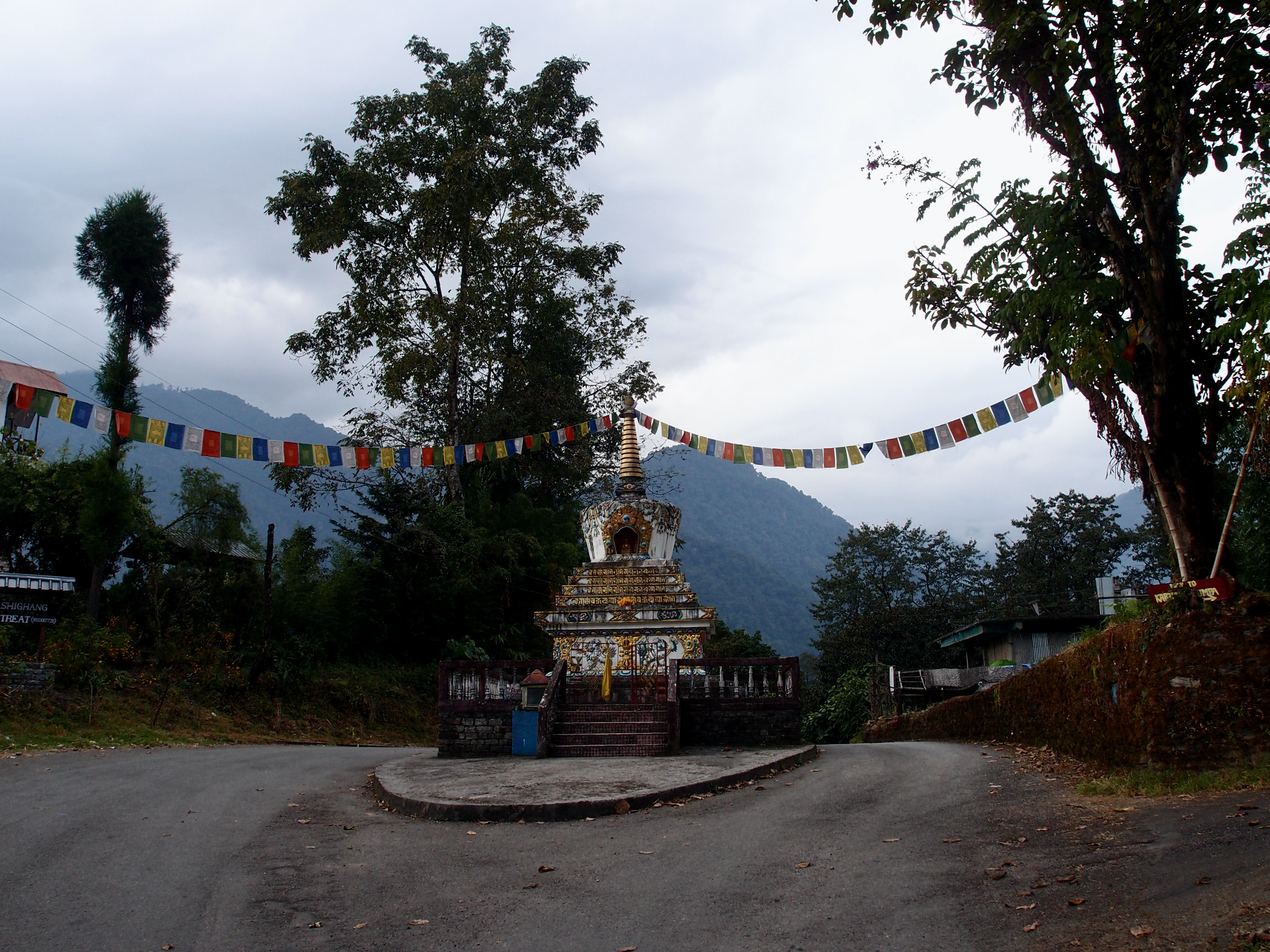 Just before sunset we arrived in Labdang. Where (Christmas) lights were welcoming us from the few houses in this little town. Not real Christmas lights. The lights were on because of a local festivity that was ending that day. Unfortunately I cannot recall the name. Navim was waiting for us all to drive us all in one car to Tashiding. The baskets the crew members carried were put on the roof of the jeep and exhausted and smelly we all jumped in the car. Poor Navim. On our way we bought some local beers (HIT beer), and in the guesthouse we all sat down to cheers on our achievement.