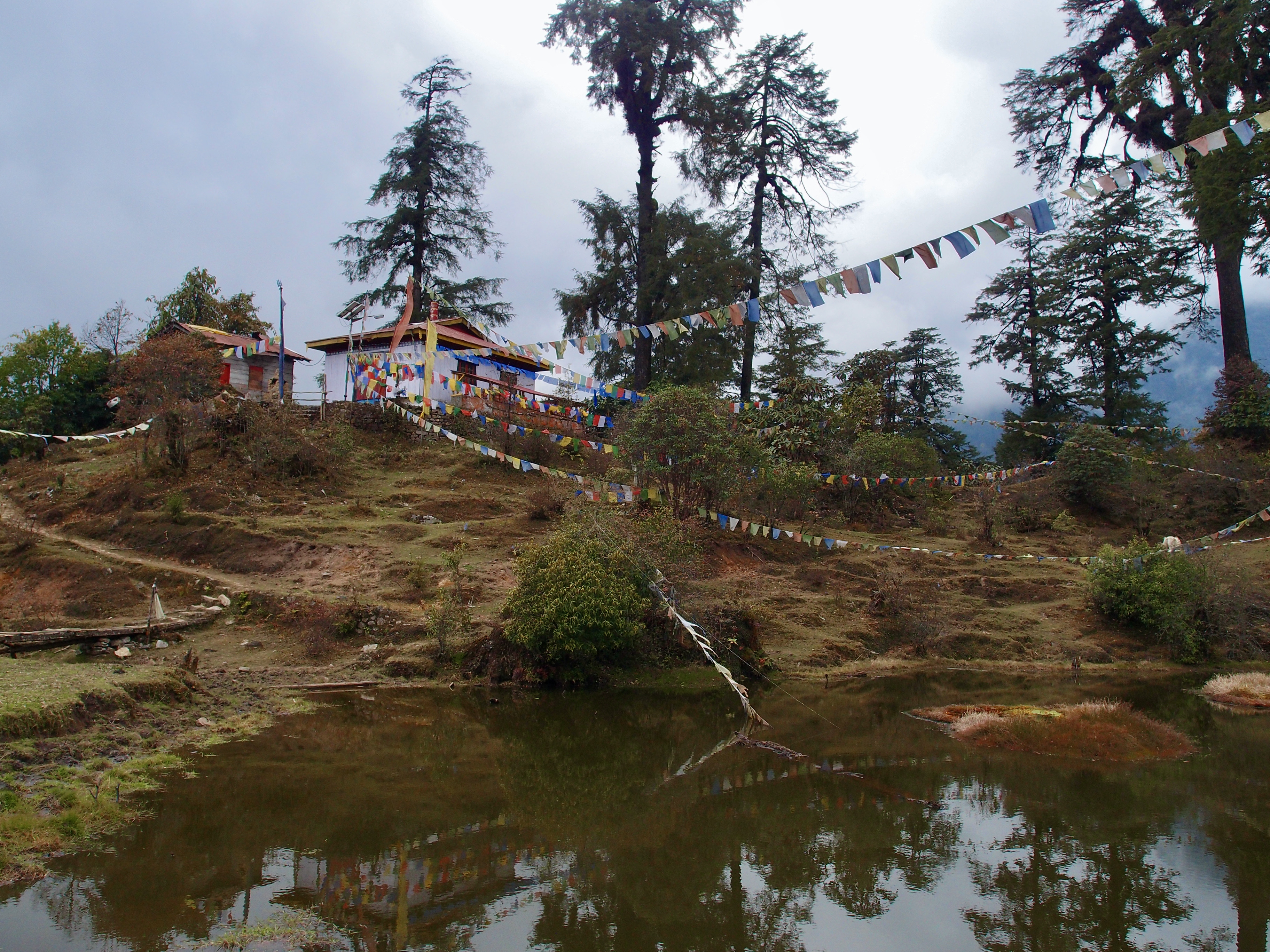 We arrived early for hot lunch and had time to discover the campsite. It was beautiful with a view over the “hills” leading back to Yuksom, a little lake, and a little monastery. Further up on a hill there were two little stupas contrasting the landscape. In Buddhism, stupas are objects of prayer and worship that contain holy relics such as bodily remains of great masters and/or profound texts.