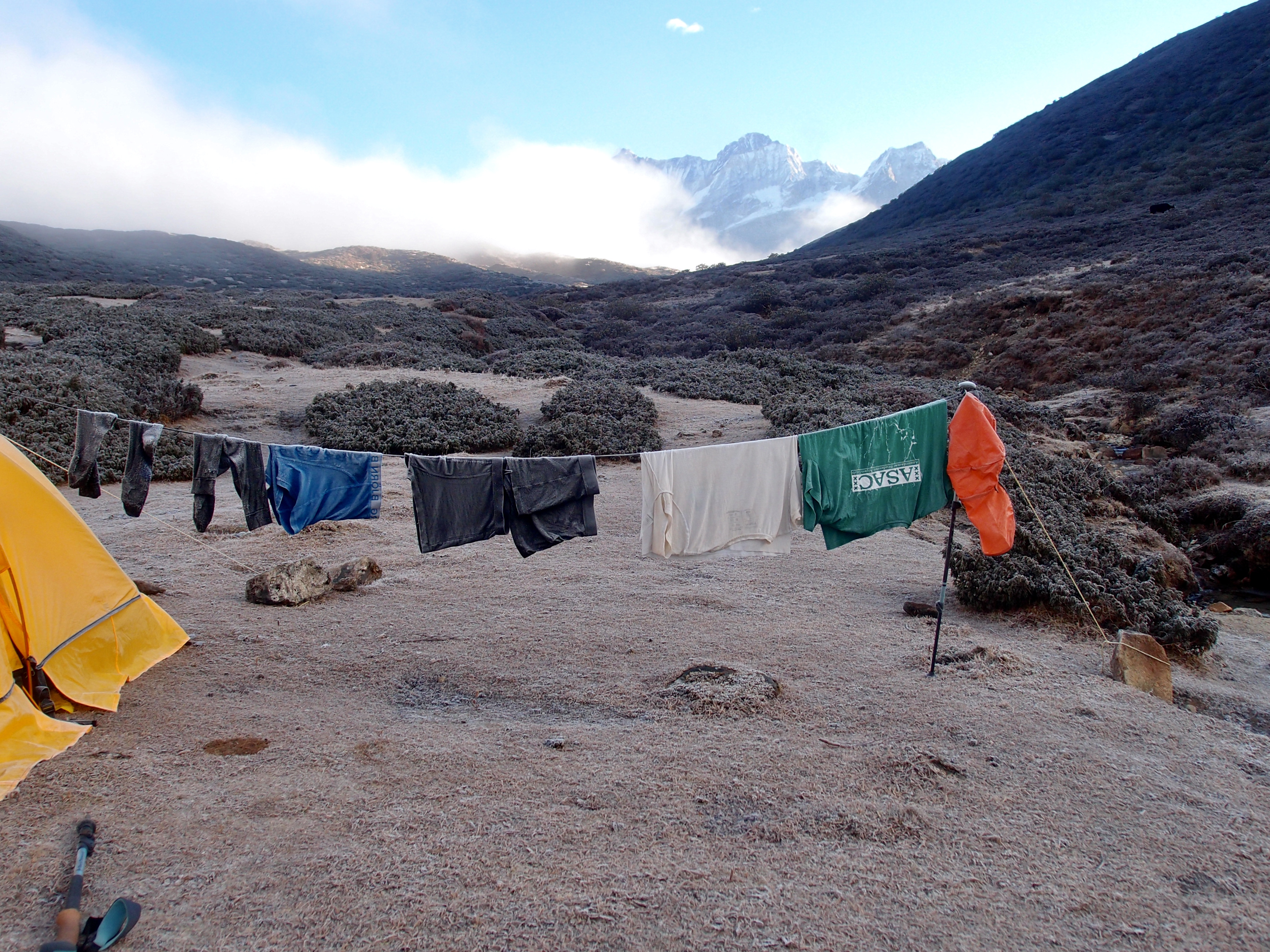 Back down we were very happy with the clear weather and decided to do some laundry (underwear, socks, and shirts). We were not in the illusion that we could smell nice after that, but it was worth a try. However, soon enough the clouds started to come in, and our hope was gone. We hung some clothes in our tent, but both (clothes in and out the tent) were frozen the next morning.