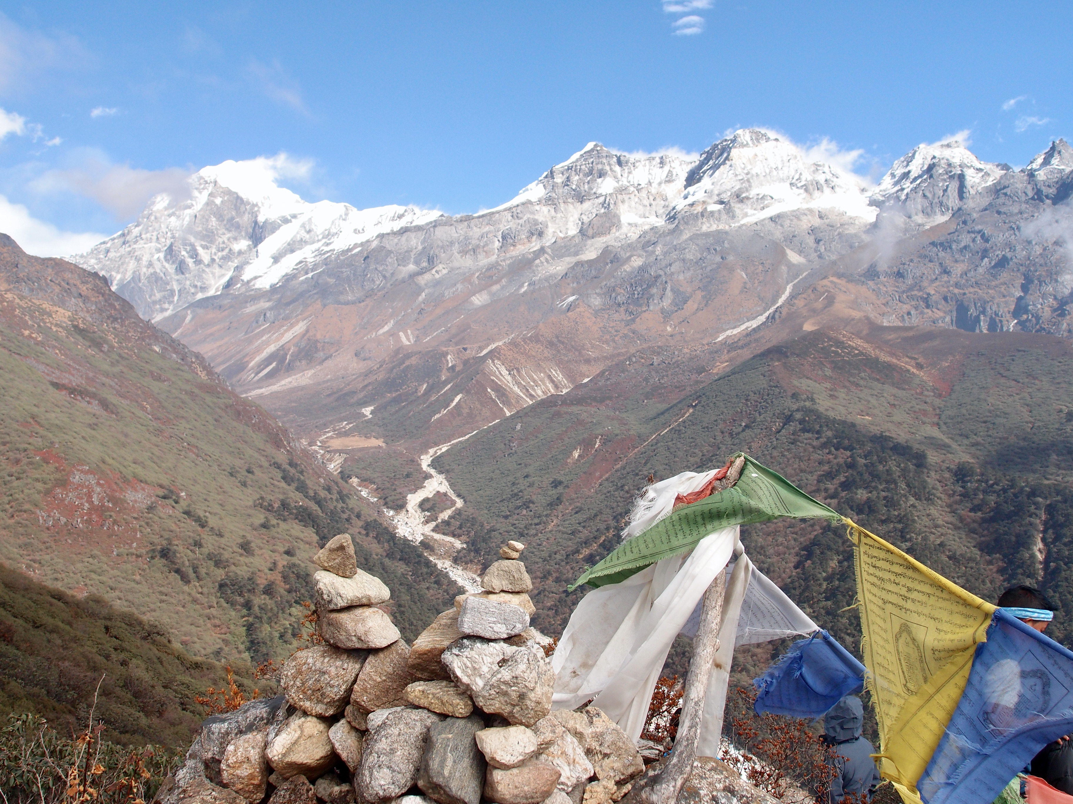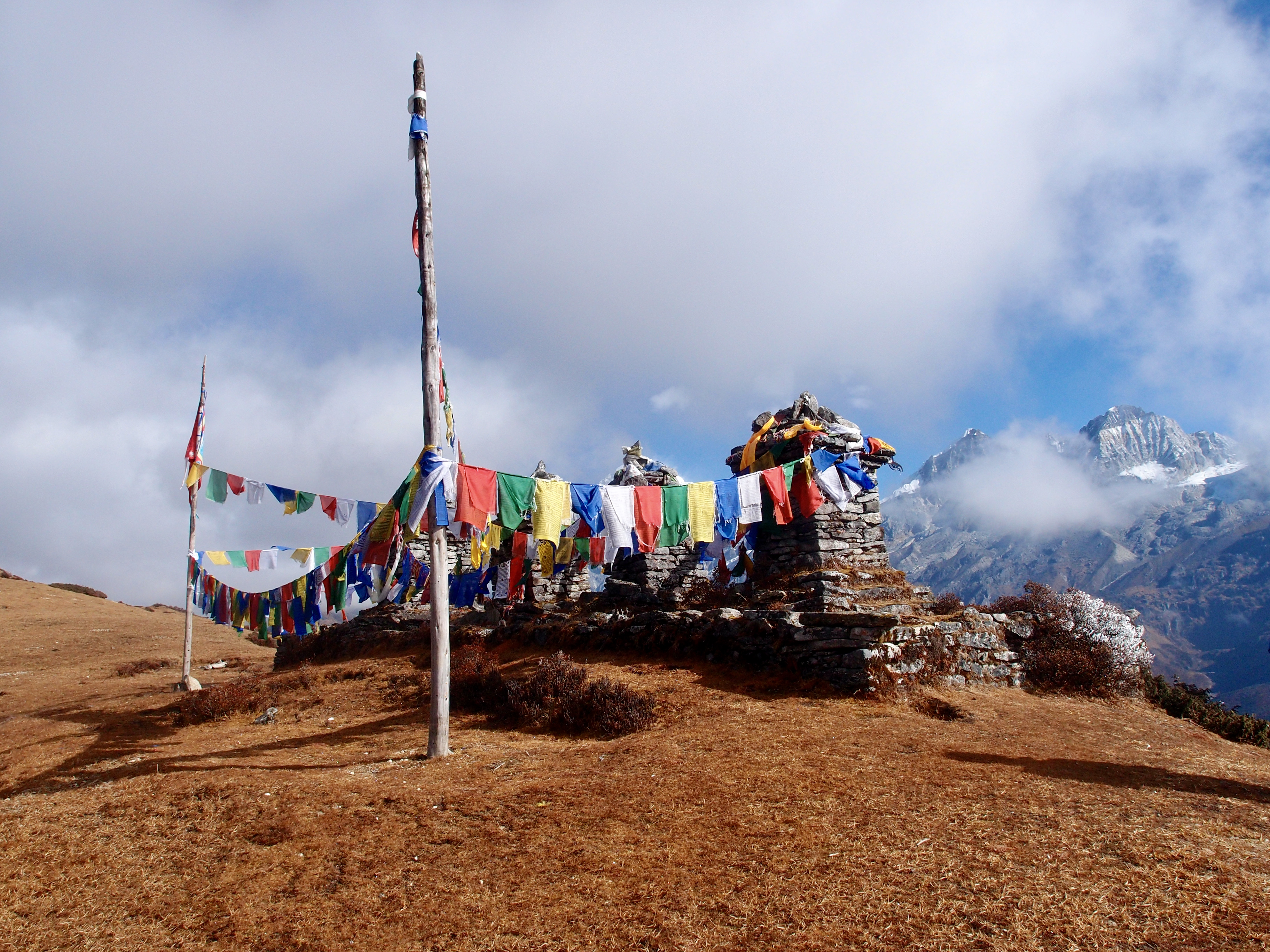 We visited a hill with two stupas, surrounded by player flags, along the way. This place is used to ask permission from the gods to enter the mountain pass. Mount Khanchendzonga (8534meter) is the third highest mountain of the world, and is considered a holy mountain for the Buddhists. Therefore it is not allowed to climb this mountain. However the Goechala pass (the trek we were doing), could bring you as close as possible to this beautiful mountain.
