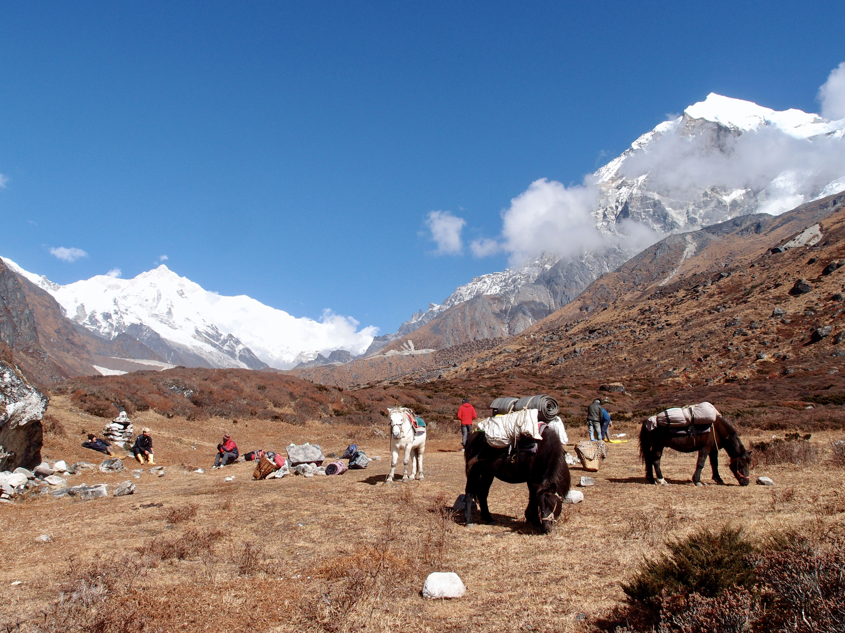 The campsite was a stunning field on the foot of a few enormous mountains. The horse and Yaks were roaming happily in this habitat.