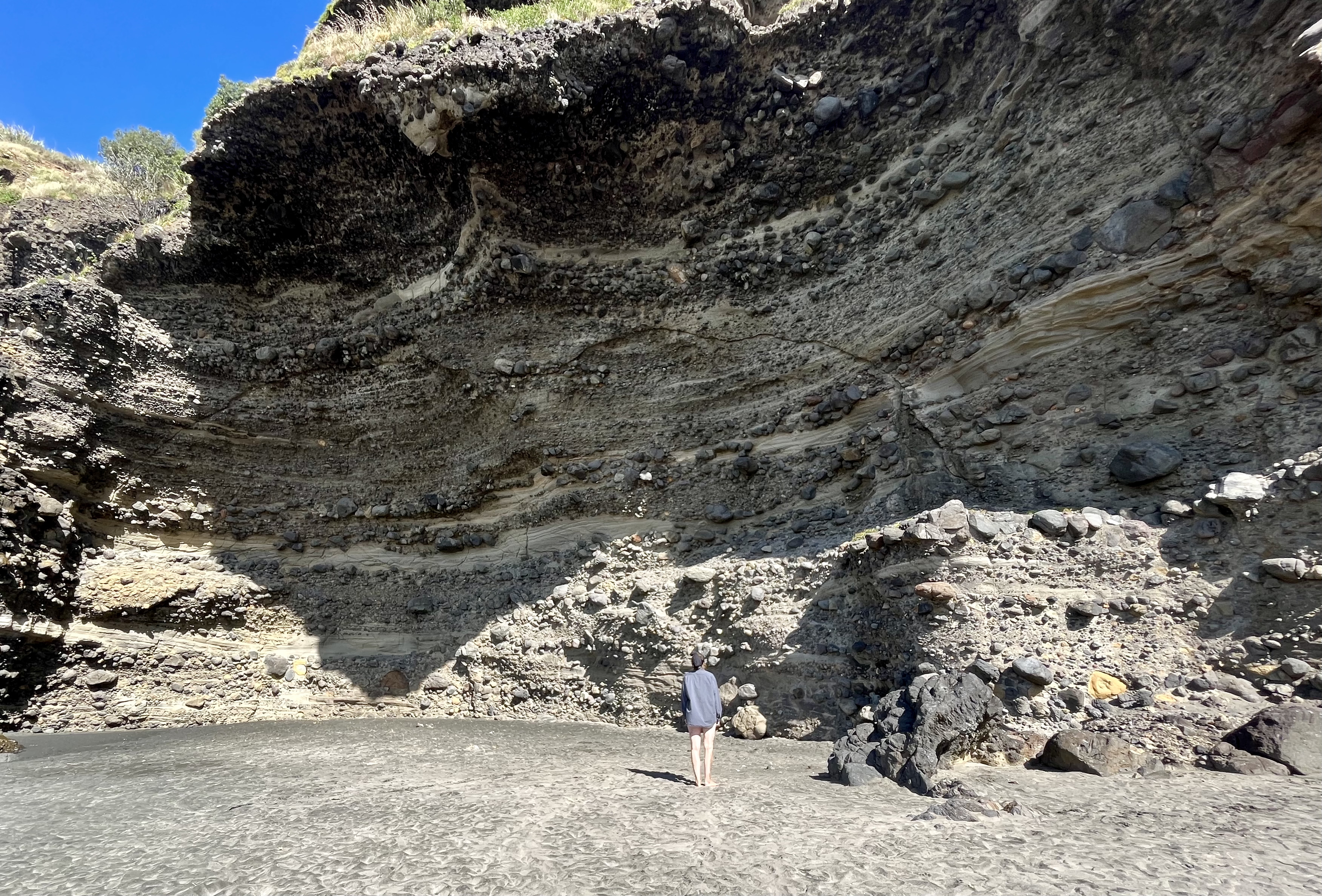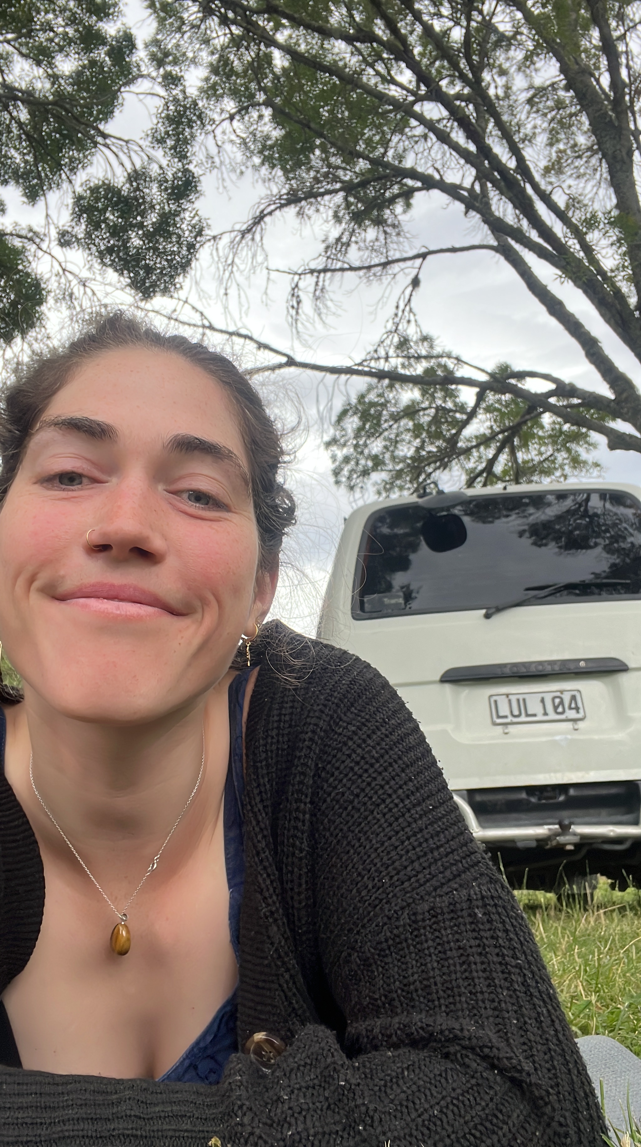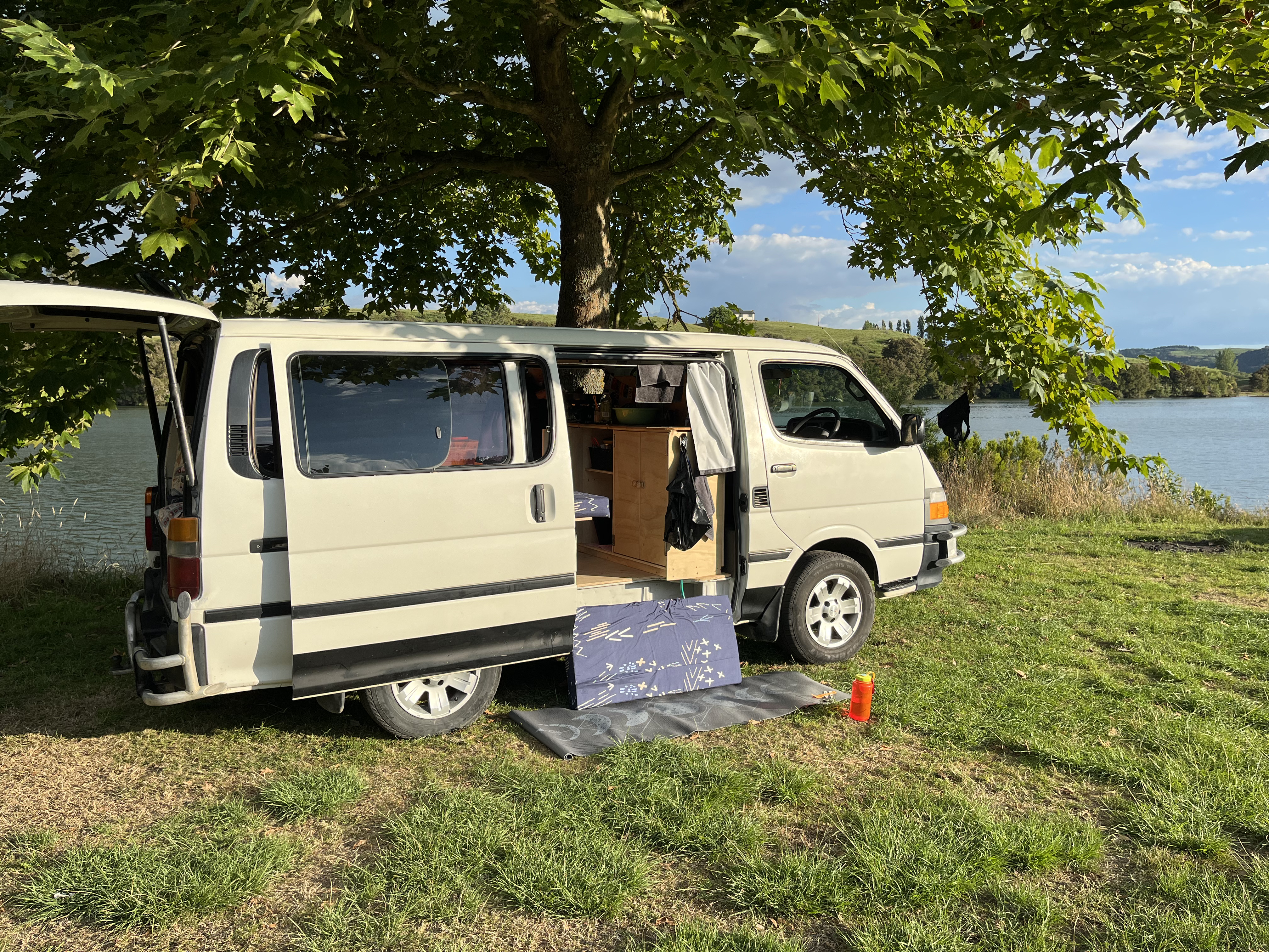 We found a campsite (Scotts Ferry Camping Ground) mid-way in a small farm town close by the beach (1km). It was a simple campsite, but there were picknick tables where we could drink our red Kiwi wine from plastic wine glasses – we bought in thrift shop a few weeks before (essential glamping gear) – flat grass where I could do some yoga, showers, and toilets. We arrived in the early evening, after driving all the way to the beach to discover that the campsite was not there, and our new neighbors told us we could just stand there and the owner would pass by the next morning to collect the money (15 NZD). Indeed he did driving in his big 4WD pick-up truck, stepping out of the car in his rainboots. A small guy with a big accent came to ask us for the money.