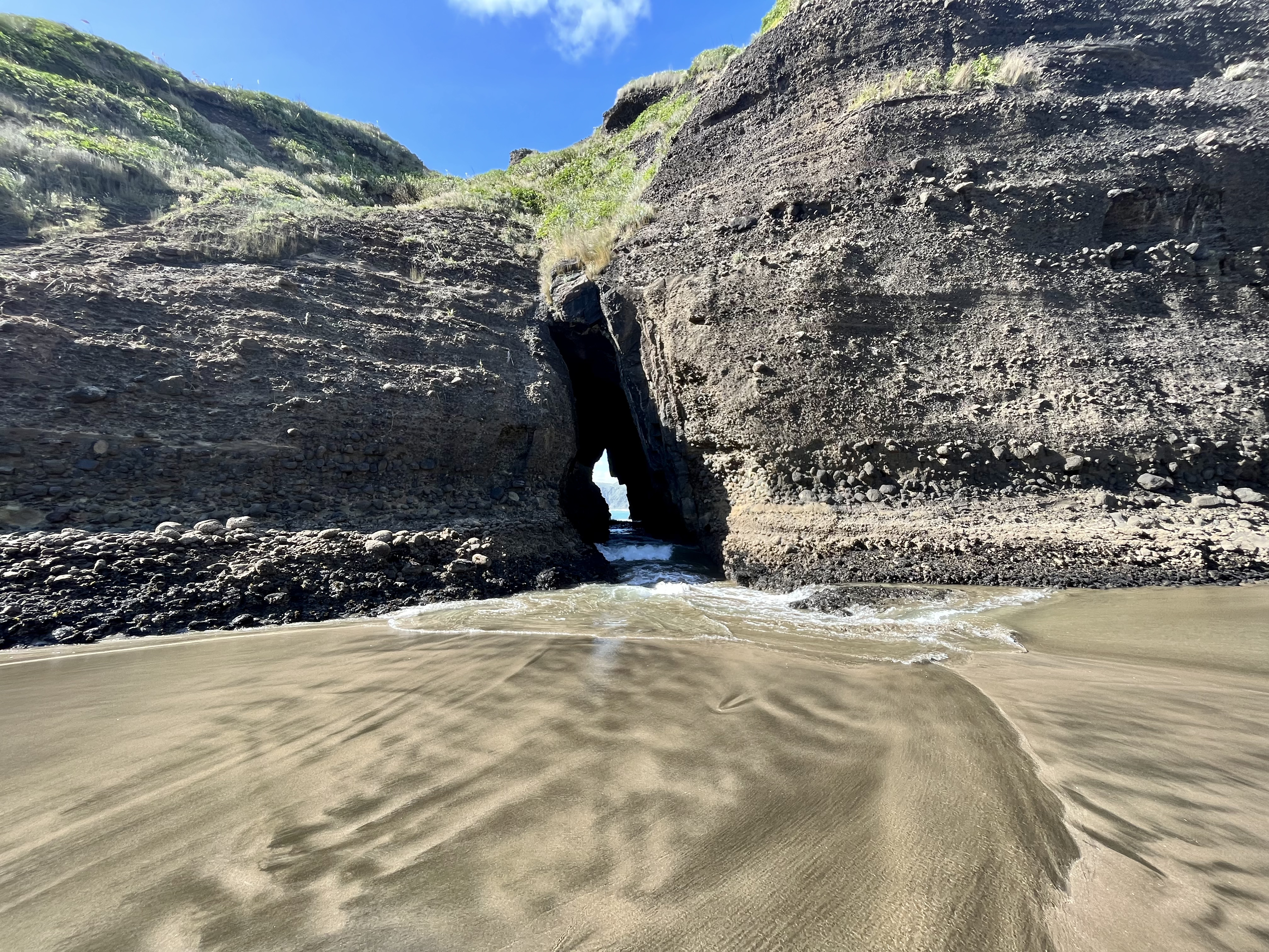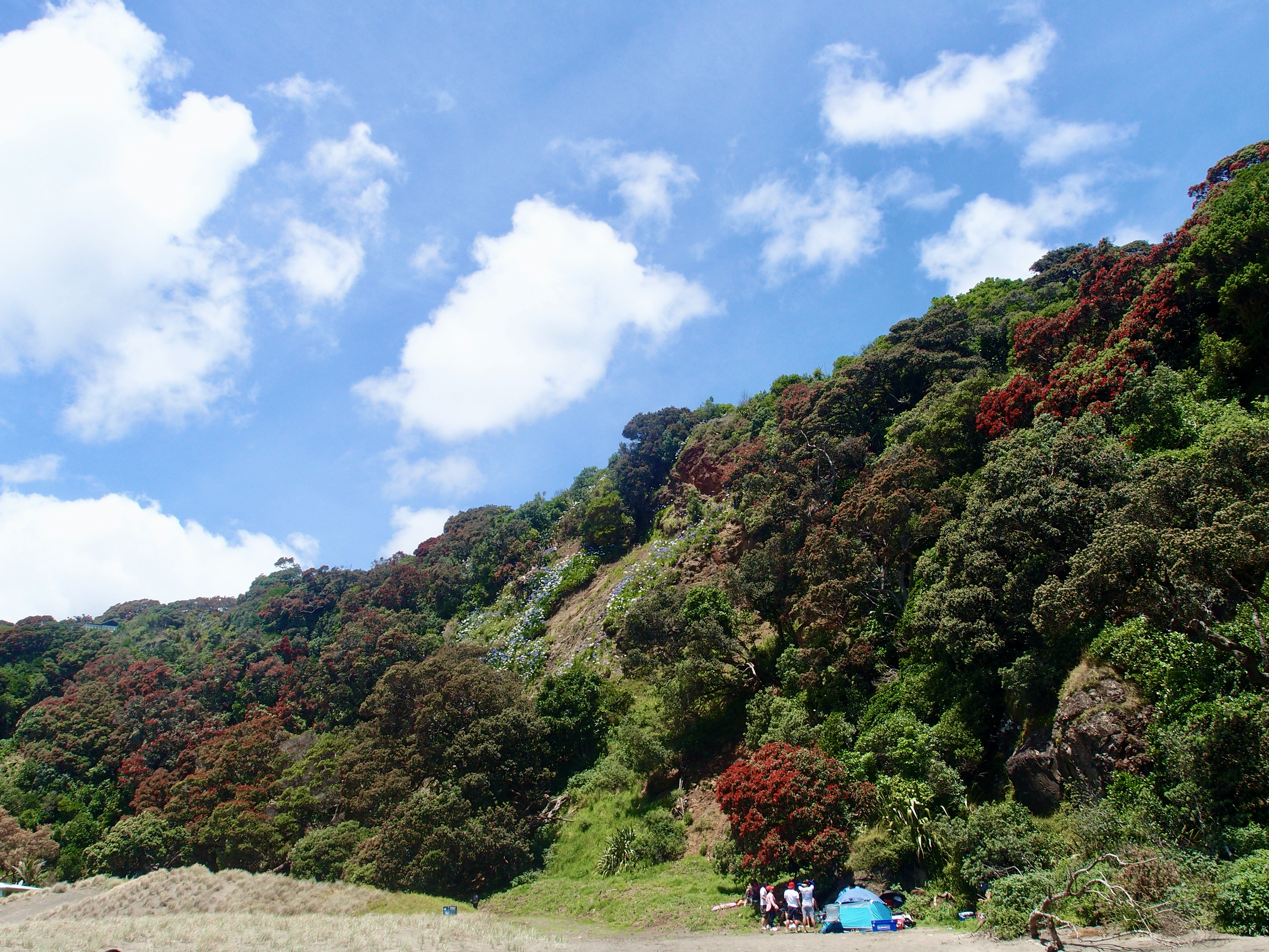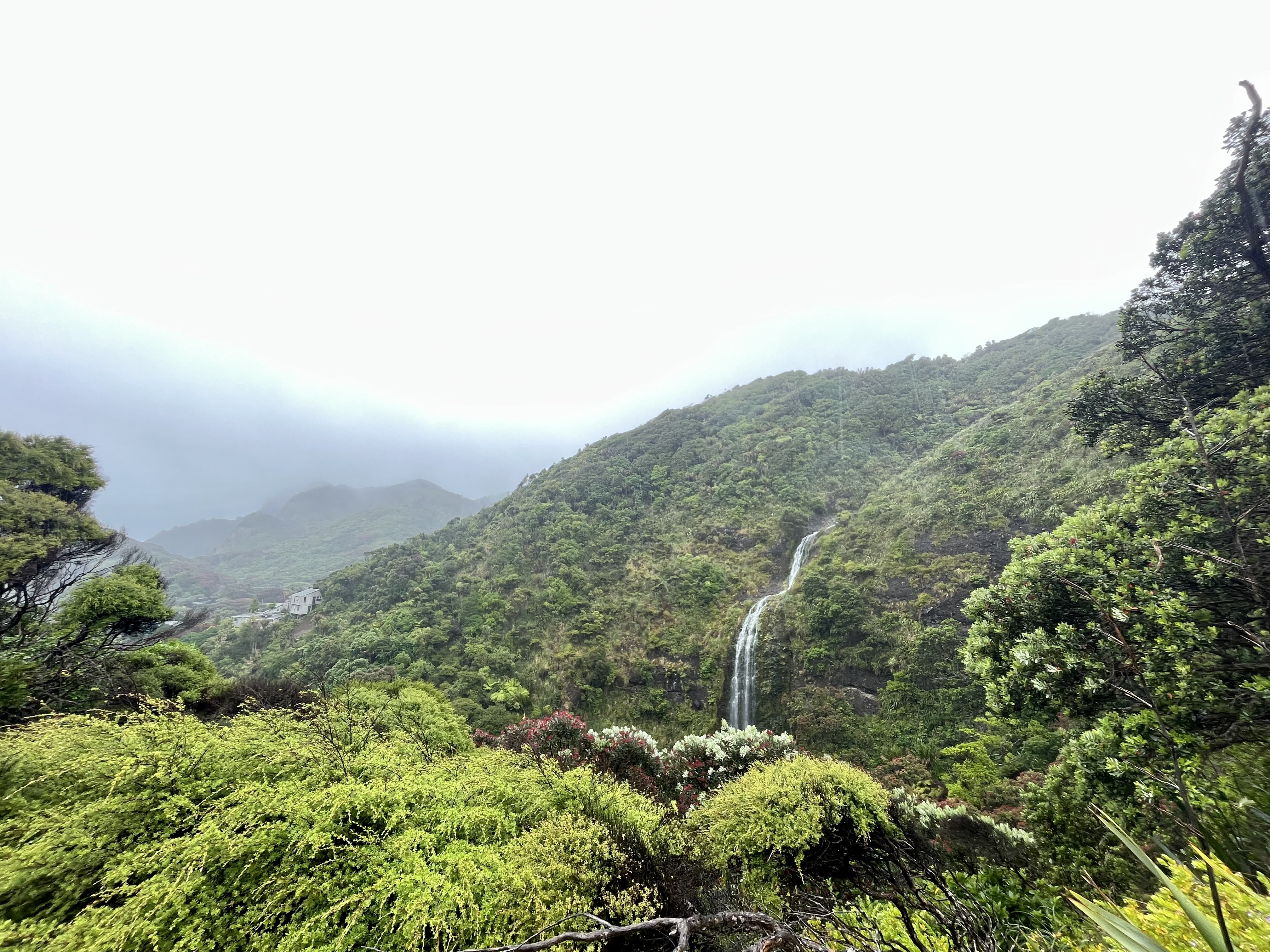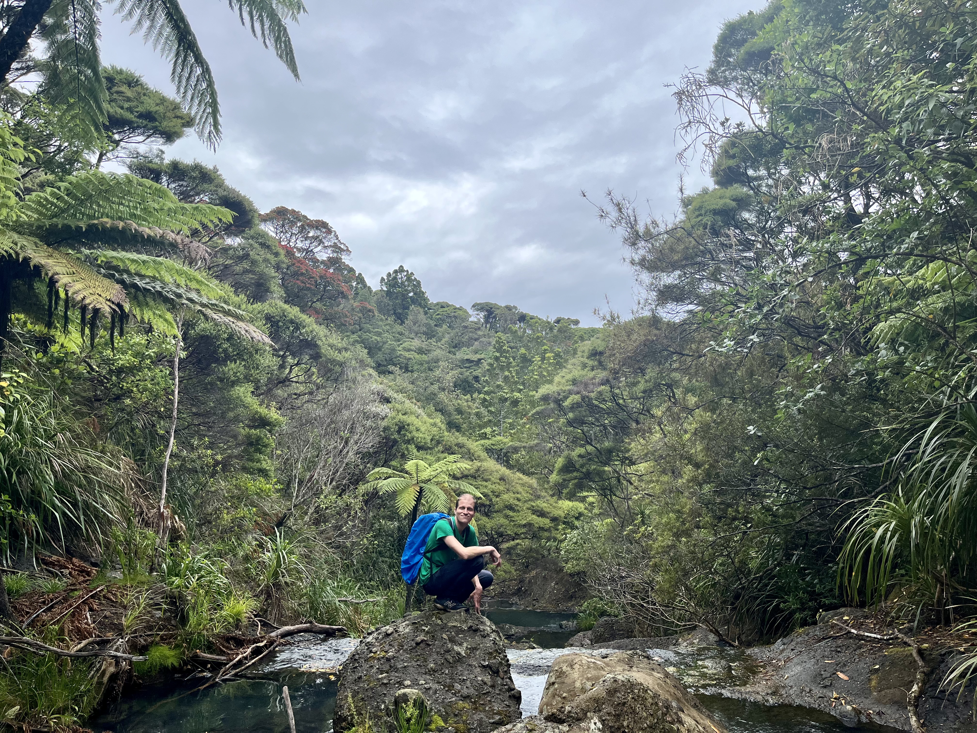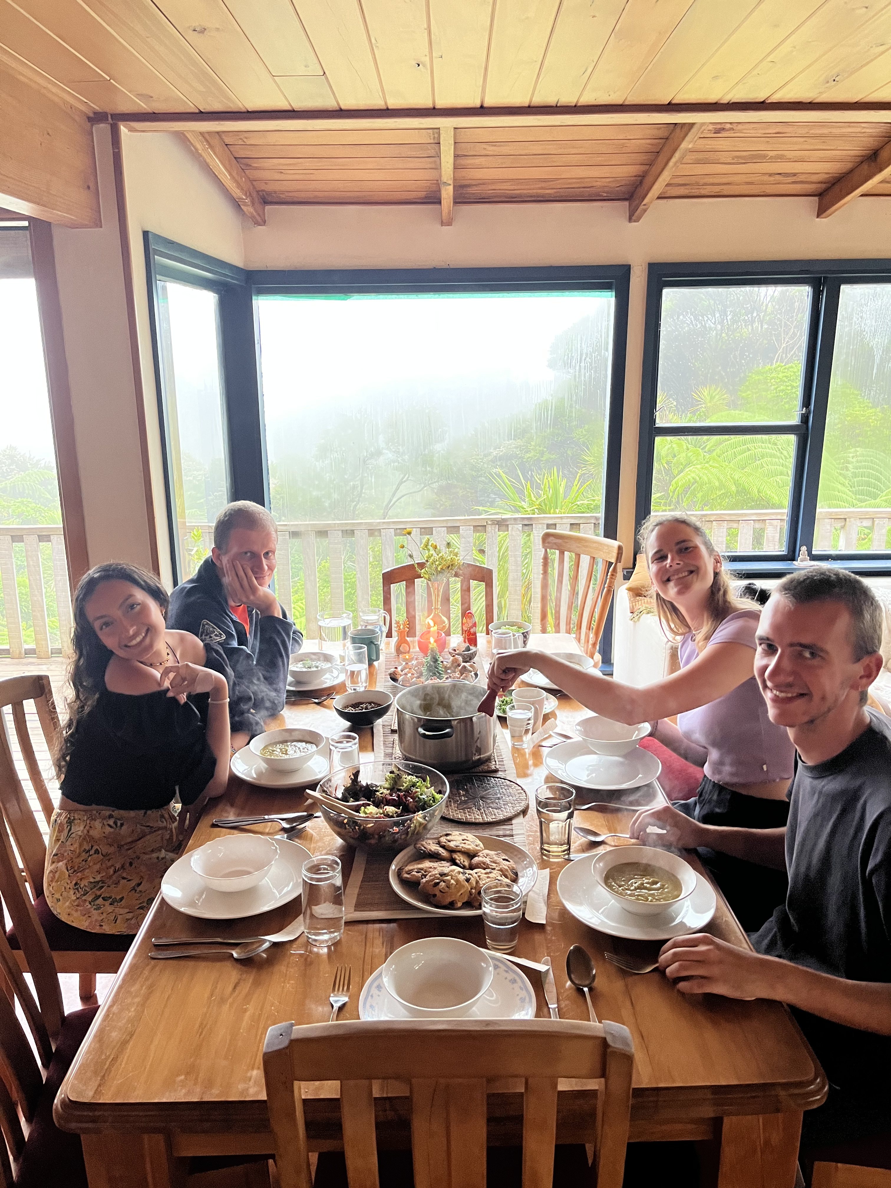 Still Jelle and I decided to go on a hike on the 24th of December. First we went to a sacred waterfall. A 20 minute hike through the Jungle and over some rocks with some ropes attached to trees to help you get through). The water here is sacred for the Māori and you are not supposed to eat or urinate/defecate here (we learned later). Māori used to give birth in the pools below the waterfall. In the peak of the rainstorm Jelle and I decided to go for a skinny dip, because we would get wet anyway. After that we ate a bar (oops.) and made our way back up to Sacred Earth. We actually wanted to go to the beach and not to the sacred waterfall. The rain stopped and we decided to walk to the beach. Later we learned that the trail to the beach was actually closed, which explained the amount of overgrown (wet) plants. We made our way down, and soon enough it started too rain again. We were soaked. My waterproof hiking boots were filled with water because my not waterproof drained pants were leaking into my shoes. Almost all the way down we found shelter under a tree with a view over another waterfall (Karekare waterfall). After a lunch break, Jelle wanted to go up again, but I was stubborn. We were supposed to be almost there anyway. So yes, we made it. We had a swim, we saw our friends (that were the smarter ones of the group and took the car), and decided to not take a ride back up, but walk up (I don’t fully understand why I made that decision now). Christmas day was a cozy day indoors with delicious food (everyone made a course), and lovely people. A Christmas like we know it from home.