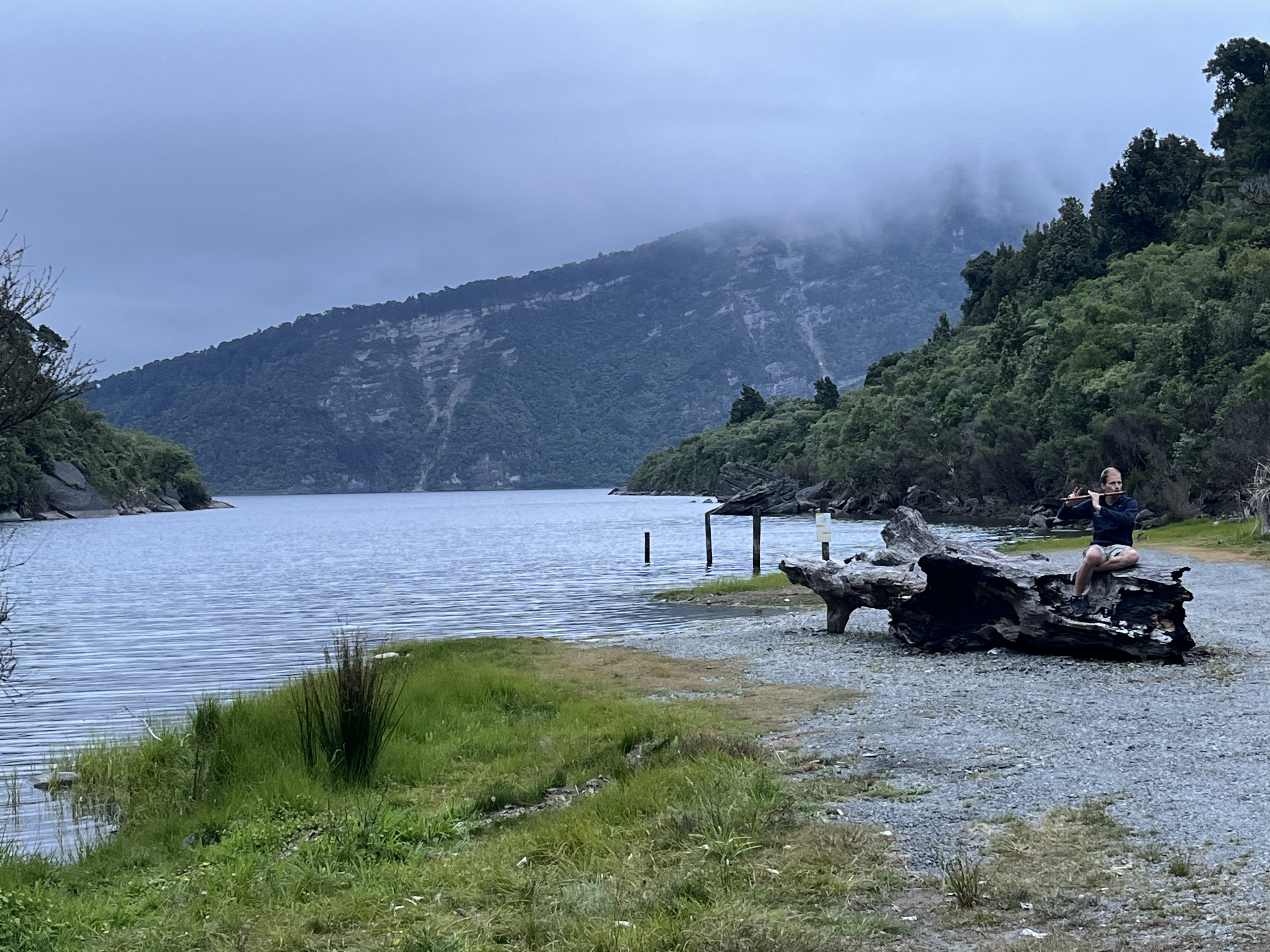 Last, we went to a small outdoor climbing rock only a 20 minutes drive away from town. The rock (Kinloch Crag K1) was in the middle of a little forest, but when climbing high enough you had a view over the trees over lake Taupō. We managed to climb 2 routs before heading back all the way to Tongariro NP.