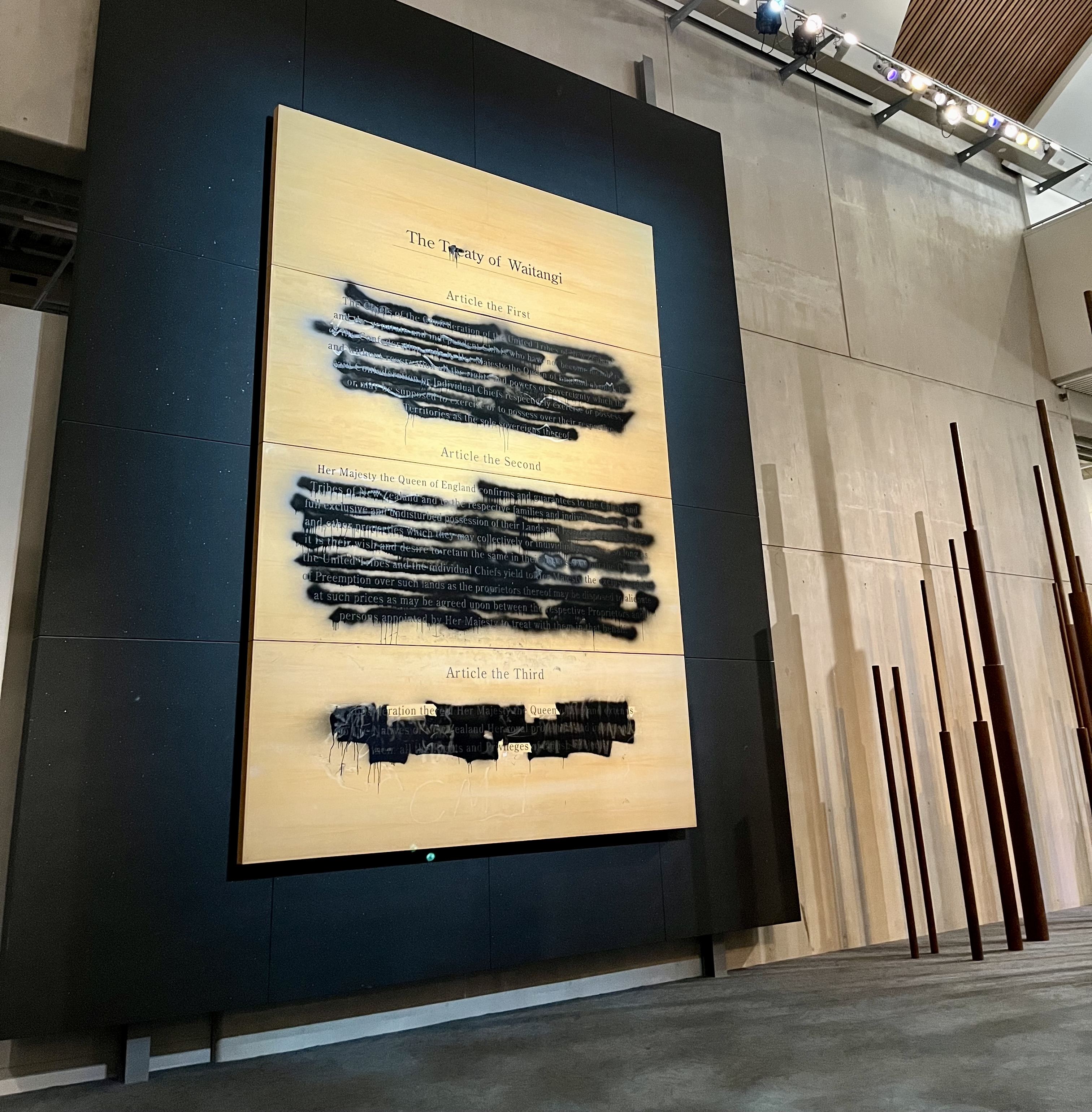 The next day we walked back to the city again, we had breakfast at Mystic Kitchen, and made our way to the National Museum: Te Papa Tongarewa. This museum is the source of the most information about New Zealand that you read in this blog. Most impressive were the two large panels showing some parts of the Treaty of Waitangi. This treaty was first signed in 1840 by Captain William Hobson as consul for the British Crown and some Māori chiefs. The treaty was created to establish a British governor and to consider Māori ownership over the lands and other properties. More than 500 Māori chiefs signed the translated version of the treaty in the hope for new relationship that would protect Māori rights. On a protest action on December 2011 the panel with the English version of the treaty was defaced. The “original” English version of the treaty is not an accurate translation of the Māori version of the treaty, and protesters want the museum to take this English version down. The Māori version is the only right version. For example, the English version refers to absolute sovereignty – supreme rule over the entire country, while in the Māori version this is translated in government. Furthermore, in the Māori version “tino rangatiratanga” (chiefly authority) is promised, while not in the English.